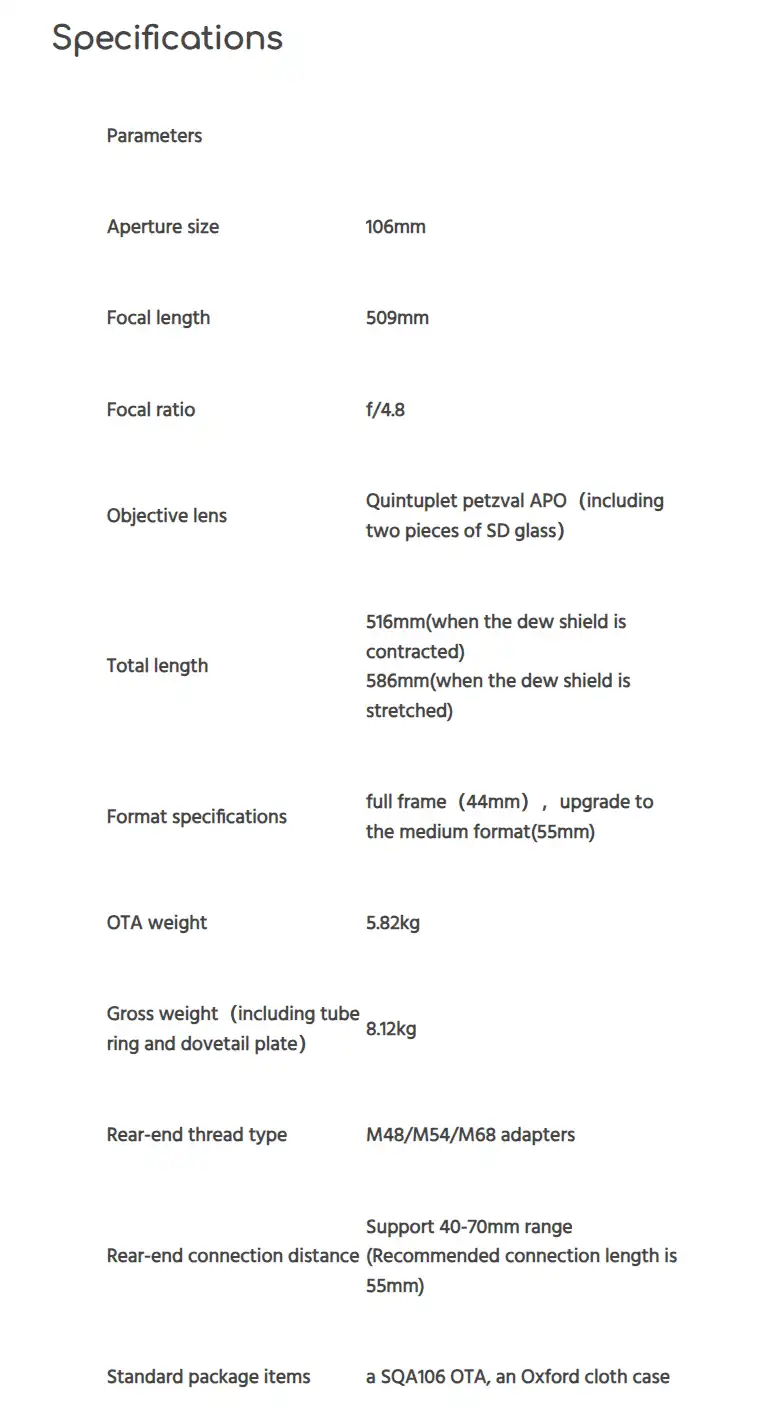 - Included Accessories: The SQA106 package comes fully equipped with adapters, a Losmandy-style dovetail, multifunctional tube rings, dual finder bases, and a protective Oxford cloth carrying case.