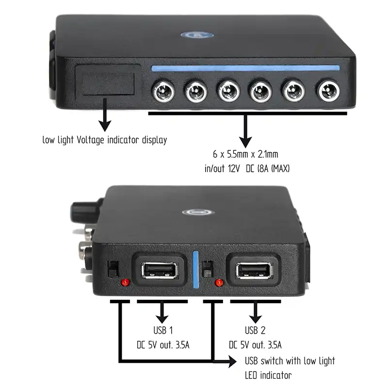 • 6 x 12V in/out standar Jacks. 5.5mm x 2.1mm.