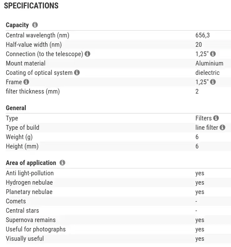The Baader H-alpha 1¼” (28.5 mm) filter with a 20nm FWHM is optimized for deep-sky visual observation and H-alpha astrophotography with modern CCD and CMOS cameras. It provides enhanced contrast of H-II emission regions even under light-polluted skies.