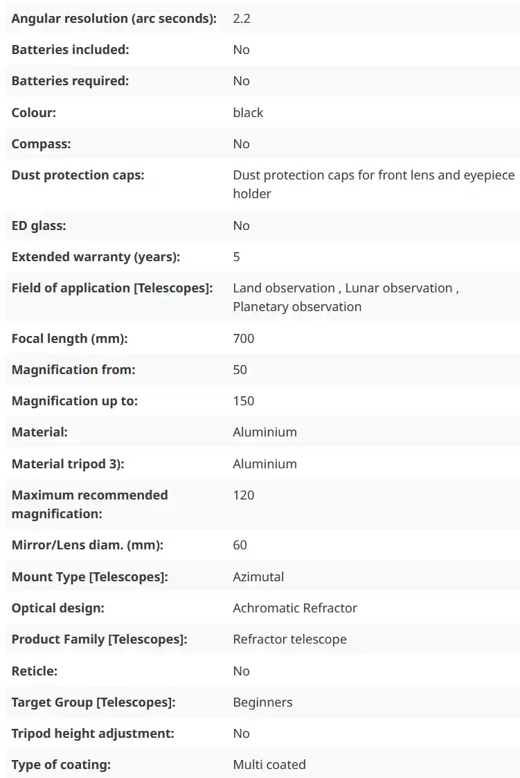Set up and start being amazed right away: the BRESSER Arcturus 60/700 AZ lens telescope takes you one step closer to the fascinating world of planets and star clusters. The complete astronomy set includes everything you need for your immediate start in celestial observation: an astronomical lens telescope with 60 mm aperture and 700 mm focal length, an azimuthal mount, a tripod and many accessories. The system is very easy to use – perfect for introducing children to the exciting hobby of astronomy.