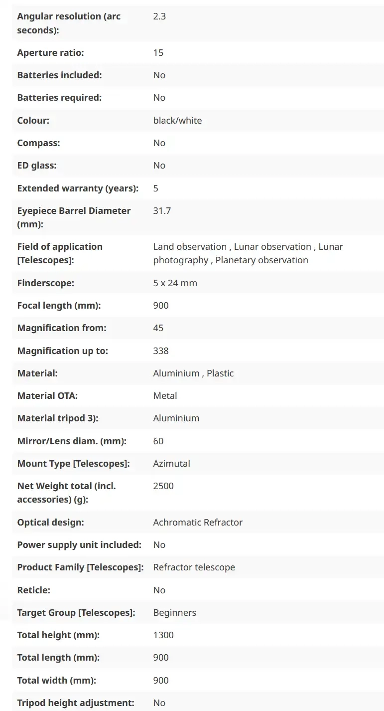 - cope of delivery: telescope, azimuthal mount, LED finderscope, 1.5x Erecting lens, star diagonal, eyepieces (31.7 mm): 4mm, 12.5mm, 20mm, aluminum tripod with accessory tray, astronomy software, smartphone camera adapter, user manual