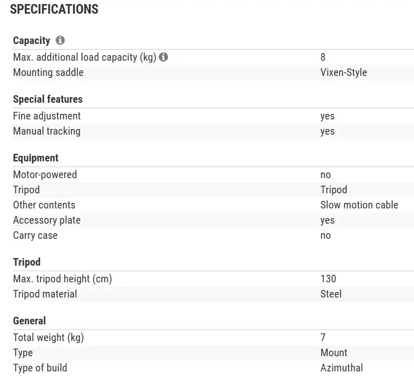 The mount head is made from die cast aluminium and coated with white powder. Both axes have precise worm gears which can be accurately set with the help of very flexible shafts. The mount head can be individually inclined. The adjustment range is approx. +/- 45°. This enables an optimal range of lens tube movement and provides the best possible observing comfort even close to the zenith.