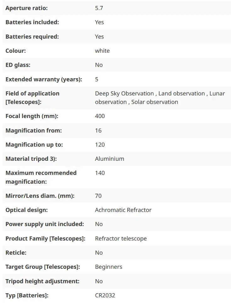 Embark on your own celestial journey into the wonders of astronomy with the BRESSER SpaceRacer 70/400 Refractor Telescope. It’s the ideal companion for anyone who’s ever wanted to take a closer look at lunar craters, planetary rings, or dazzling star clusters. With the easy-to-use augmented reality app, you can start exploring immediately. Featuring optics with a 70 mm aperture and a 400 mm focal length, the compact telescope allows you to enjoy stunning wide-field views. The included two eyepieces and 3x Barlow lens provide magnifications ranging from 16x to 120x.