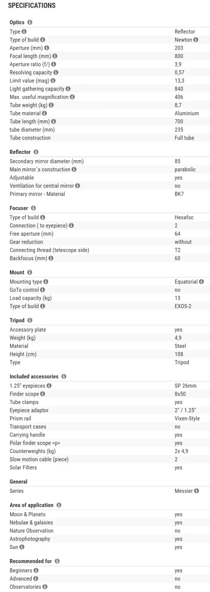 - Thanks to its fast aperture ratio of f/3.9, the Newtonian with parabolic primary mirror allows deeper exposures with the same exposure time.