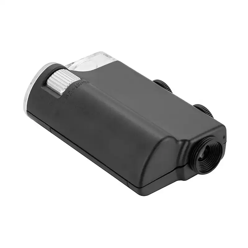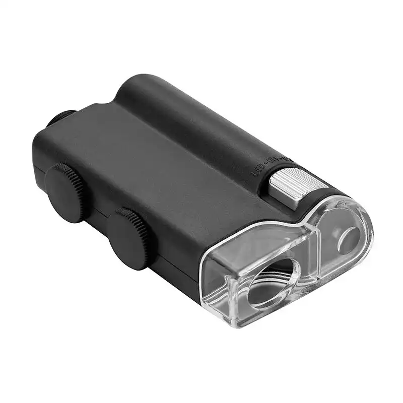 Pocket microscopes for verifying currency are equipped with UV or LED lights. These small optical instruments easily fit in a jacket pocket and can protect you from accidental financial losses. This series includes models with fixed or smooth variable magnification, with one or several types of light; powered by batteries or an integral battery. Some microscopes have clips for attaching a smartphone.