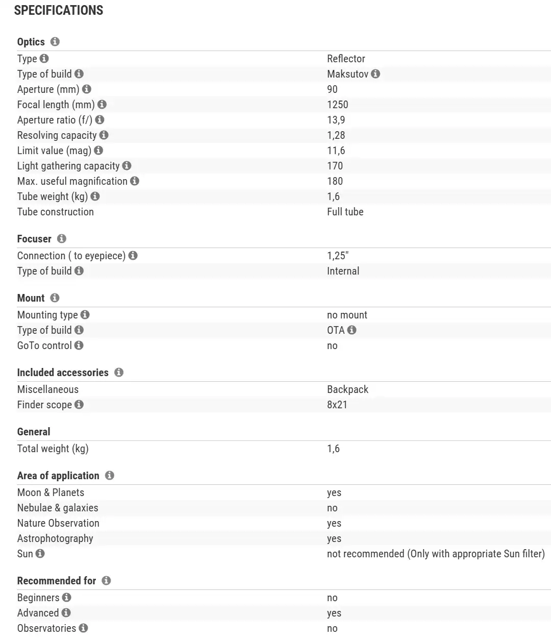 The Skywatcher Mak 90 is particularly compact and so is ideal for nature-watching. It is quickly assembled for any kind of observing. Since the OTA fits in a small backpack, it is always ready for any adventure. Whether on a hike, traveling on vacation or even on a planned excursion – just grab the backpack and you have everything you will need.