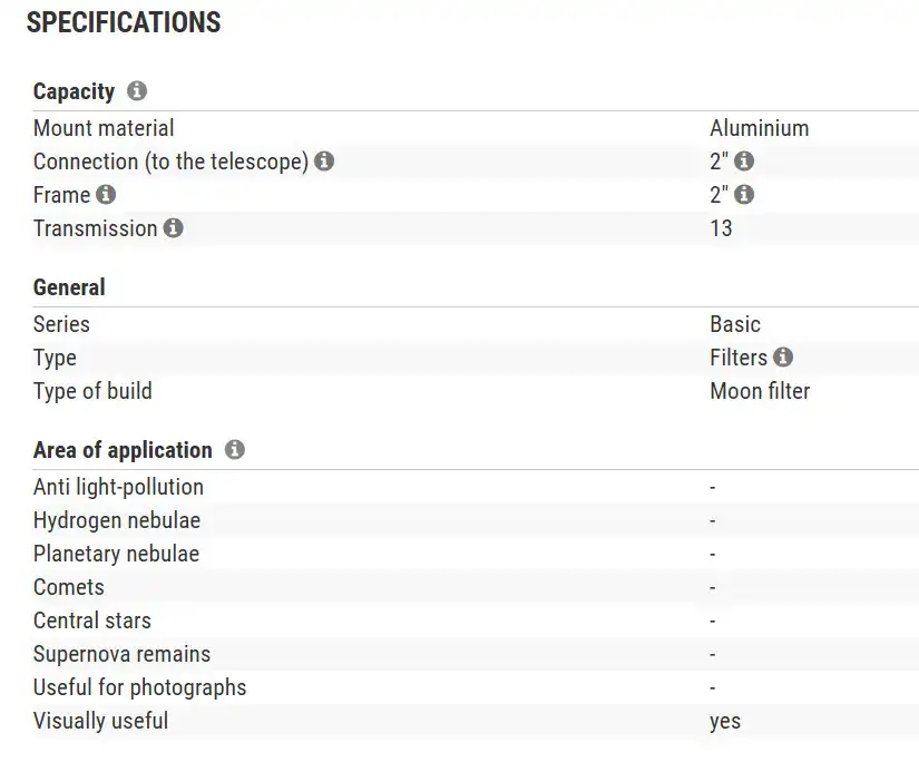 The Omegon Moon filter reduces the brightness of the Moon, allowing only 13% of its light into your eye. This makes it ideally suited for lunar observing with larger telescopes with a 200mm aperture or larger.