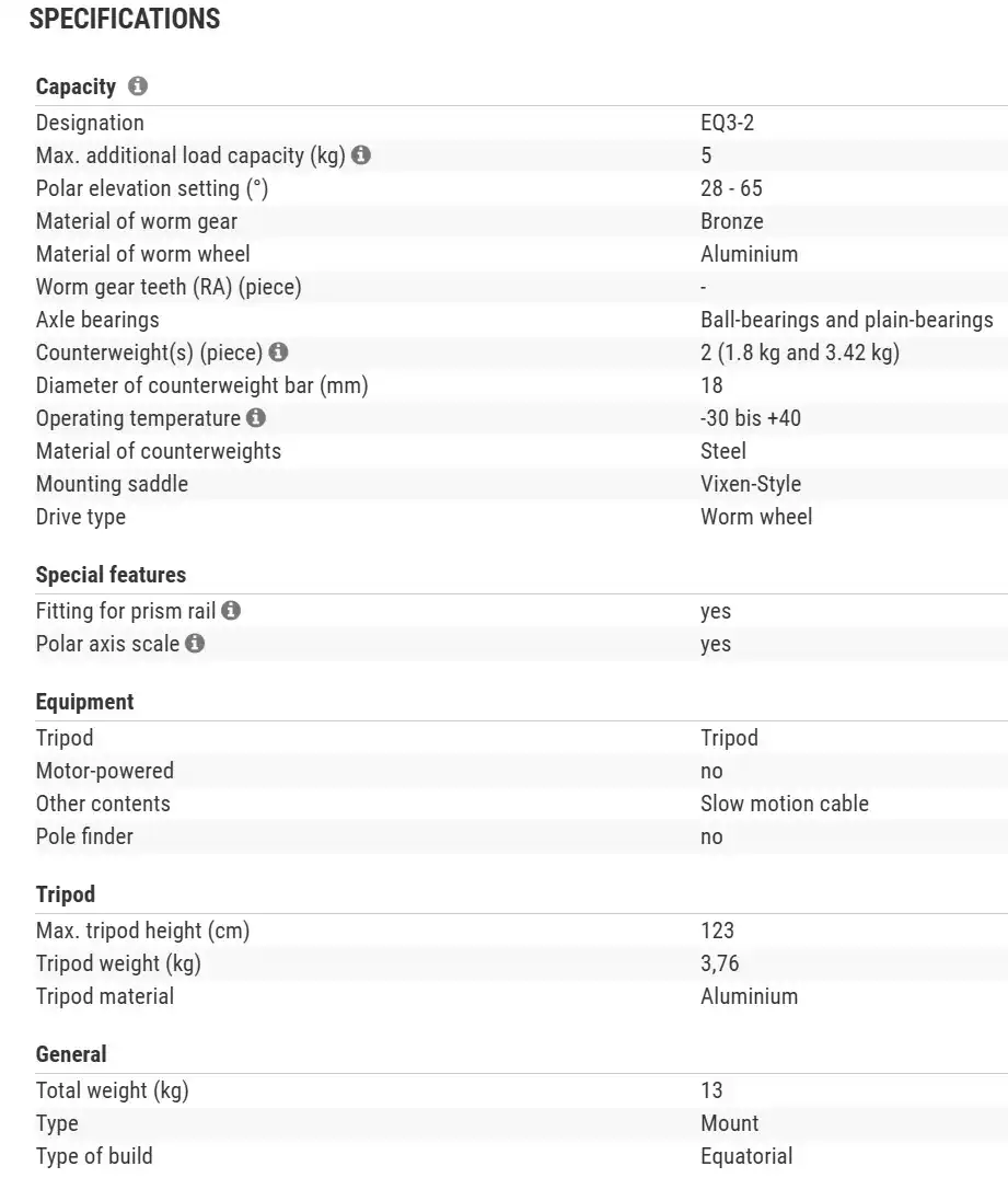 This mount is a further development of the EQ-3 mount designed in white. It provides a stable base for most medium-sized optics and is ideal for exploring the night sky. Once you have aligned the parallactic mount with the Pole Star, you can easily sight on an object, adjust it in the field of view and track it using the flexible slow-motions. Fine adjustment is possible in both right ascension and declination. The polar elevation at the observing site can be set using the fine scale provided and adjusted perfectly by using two screws. Both polar finder and electric motors plus a control can be retrofitted to both axes: the EQ3-2 is suitable not only for visual observing, but also for getting started in astrophotography. With optional add-ons such as the motor kit or GoTo upgrade kit, long exposure astrophotography also becomes possible. With a little practice, you will soon be able to produce successful images of galaxies and nebulae.