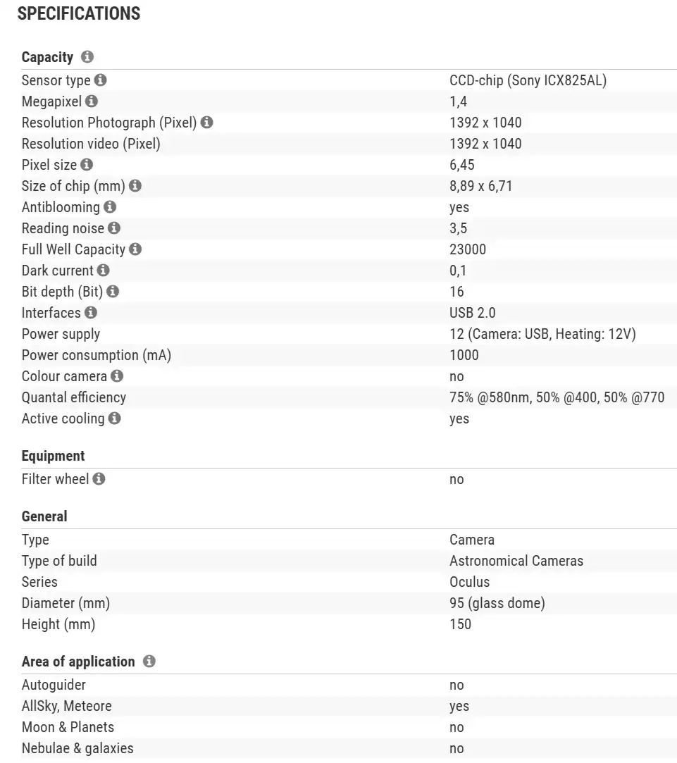 - The Oculus camera is supplied with power via an USB connection, as is common with other astronomy CCD cameras. It also has a 12V connector for the built.in heater which protects the camera from dew forming.