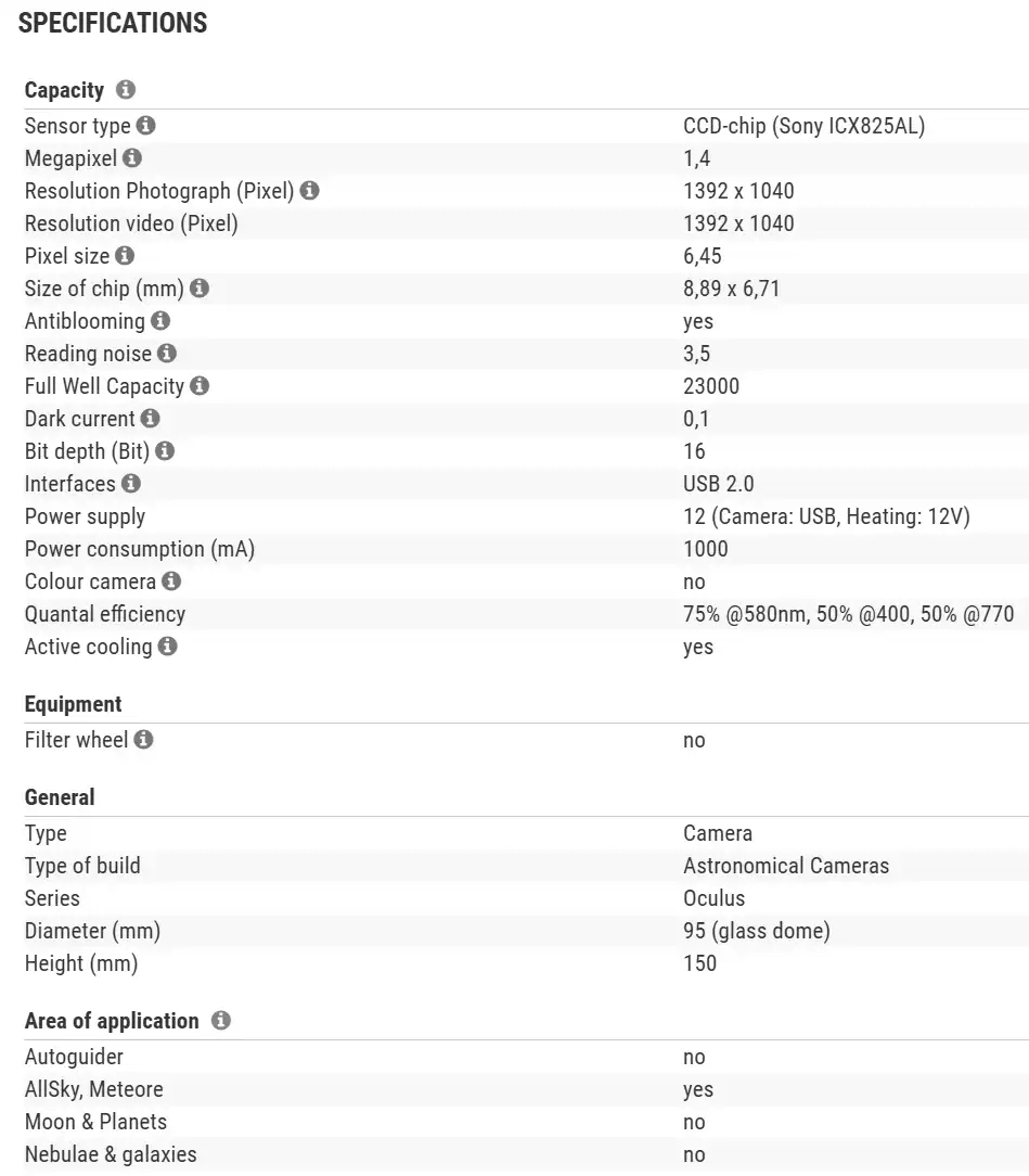 - The Oculus camera is supplied with power via an USB connection, as is common with other astronomy CCD cameras. It also has a 12V connector for the built.in heater which protects the camera from dew forming.