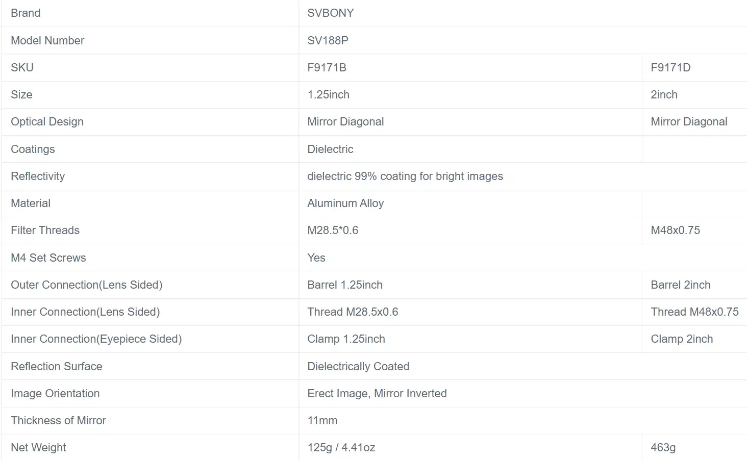 The Svbony fully metal 1.25″ Mirrors Diagonal zenith mirror offers an upright figure which is but turned backward in left and right position. It is suitable in particular for astronomical observations. The mirror depicts clean and full of contrasts.