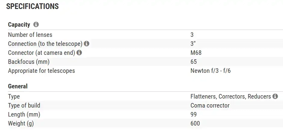 - Coma corrector for Newtonian telescopes from f/3 to f/6 with the best illumination of its class.