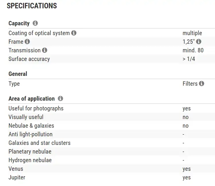 Antlia Venus-U filter is designed for imaging the cloud structure of Venus and Jupiter with CCD cameras on a telescope. Cloud details primarily reflect in the ultraviolet band which cannot normally be imaged using broadband filters. The Venus-U filter uses the latest dielectric interference coating technology to achieve high transmission efficiency and exceptional isolation of the critical UV bandwidths. The filter effectively blocks the contrast damaging frequencies beyond 400nm which typically swamp the ultraviolet cloud details on camera sensors. Like the highest quality Antlia LRGB filters, the U-Venus filter minimizes halos around bright stars and increase the contrast.