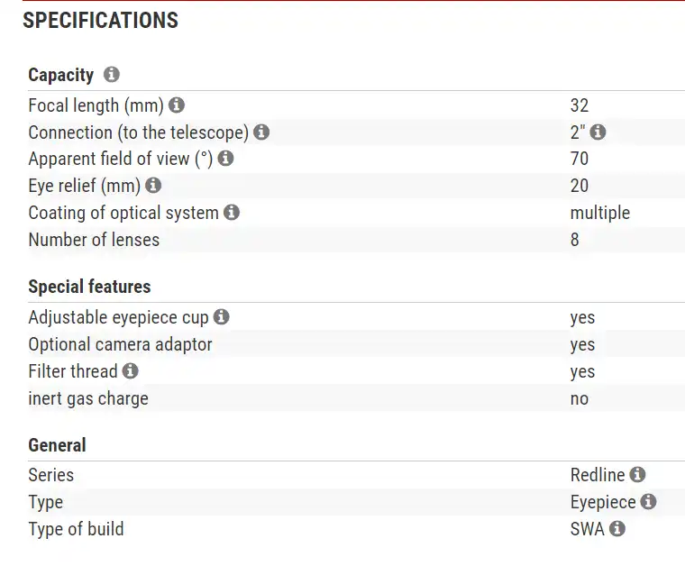 The Omegon Redline series includes 6 different focal lengths: 3.5mm, 5mm, 8mm, 13mm, 17mm, 22mm and 32mm, in order to cover an enormous range of magnifications with a single series of eyepieces. Another advantage is that all eyepieces will provide you with excellent image quality.