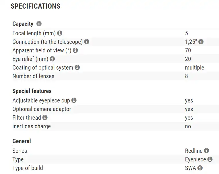The Omegon Redline series includes 6 different focal lengths: 3.5mm, 5mm, 8mm, 13mm, 17mm, 22mm and 32mm, in order to cover an enormous range of magnifications with a single series of eyepieces. Another advantage is that all eyepieces will provide you with excellent image quality.