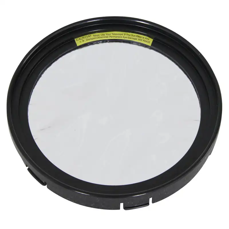 This solar filter is made using a special filter foil that provides you with a neutral white image of the Sun. With a filter factor of 100,000 times, only 0.001% of the sunlight entering the telescope reaches your eye, which means you can always observe the Sun in perfect safety.