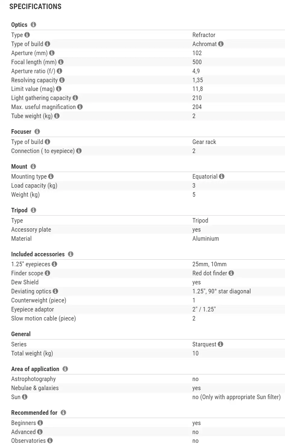 An uncomplicated instrument of very short length for viewing the heavens or for terrestrial observing. With a 102mm objective lens, this telescope allows a glimpse of the vastness of the universe at an affordable price. Its short focal length means it can be called a ‘rich field’ telescope, which allows great wide angle observing. This refractor is has more resolution than a 70mm, meaning you can see greater detail when planetary observing. The resolution is 1.14 arc-seconds. Experience the Andromeda Galaxy or the Orion Nebula almost three-dimensionally, because the gigantic field of view turns your observing into a space walk.