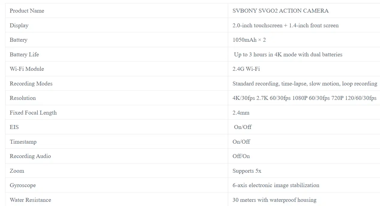 SVGO2 action camera features a built-in mono microphone and a wired external mic option for enhanced audio quality; Whether you’re recording in a quiet environment or need to capture sound from a distance.