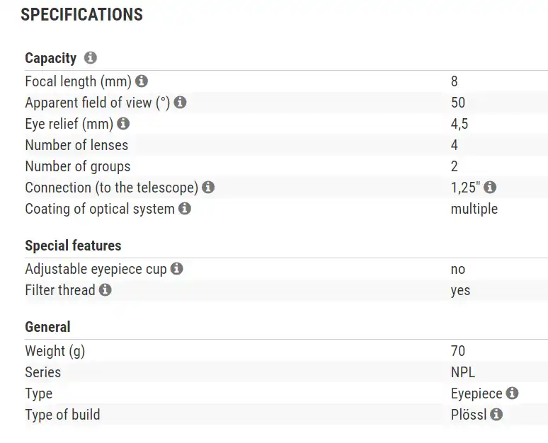 The 2-group 4-element Plossl optical design of the NPL series eyepieces delivers flat and clear images with good color correction. The lenses are fully multi-coated for high light transmission.