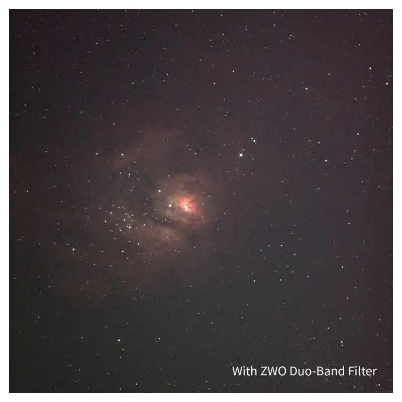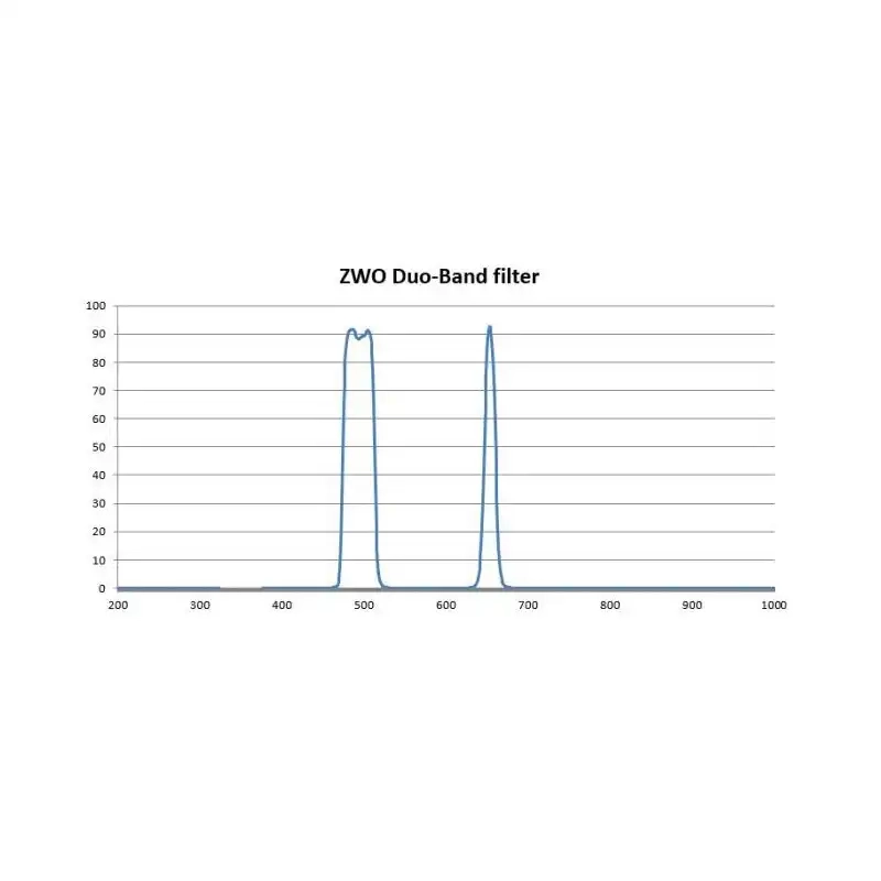 ZWO Duo-Band Filter is a dual narrowband filter primarily aimed at complementing the range of colour ASI cameras. The Duo-Band filter is aimed at the astronomer who may already own color camera and wants to image using narrowband techniques or emission objects without purchasing a mono camera, filter wheel and narrowband filter set.